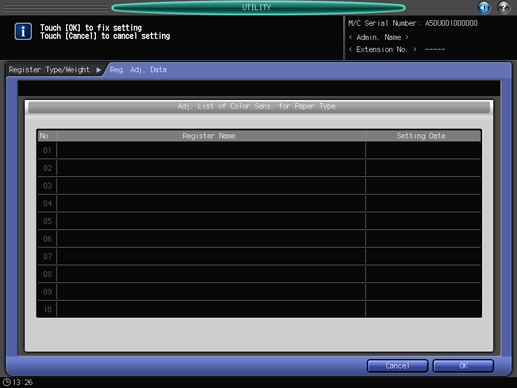 Press [OK] on the [Register Type/Weight] screen. The screen returns to the [Reg./Del. Paper Set] screen.