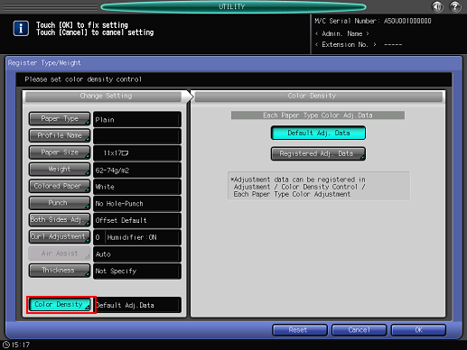 Color density control | The machine mounted with Relay Unit RU-509 provides [Color Density] on the screen. This setting is enabled when [ON] is selected for [Use Color Density Control], which is accessed from the [Adjustment Menu] screen, selecting [Color Density Control] - [Basic Settings]. | Each Paper Type Color Adj.Data: Default Adj.Data, Registered Adj. Data |