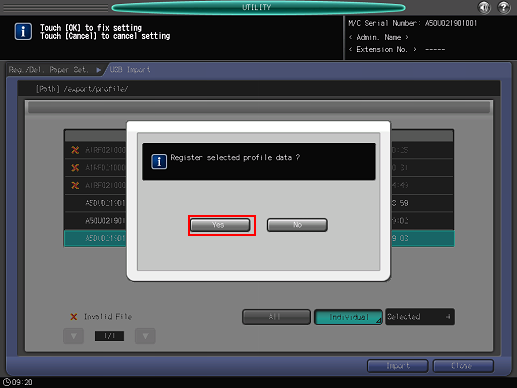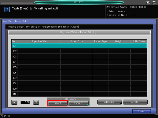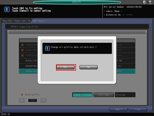 When using the importing [All] option, all the data of paper size and paper setting stored on the USB flash drive is imported and the data registered on the machine is overwritten.