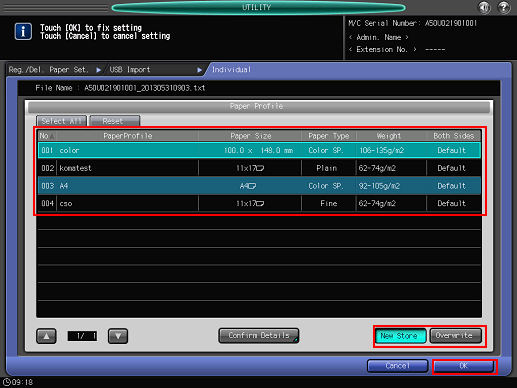 When using the importing [individual] option, the paper setting data you select is imported and the data is newly stored or overwritten on the machine. With the [New Store] option, up to 500 data, together with the number of the data that has already been registered on the machine, can be imported (The remaining data after reduction of the registered data from 500 can be imported). With the [Overwrite] option, up to 500 data can be imported.