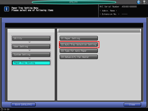 Press [System Setting] on the [User Setting Menu] screen, and then press [Paper Tray Setting] and [Auto Tray Selection Setting] in sequence.