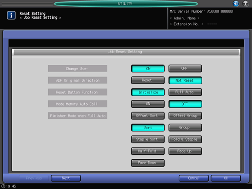 [Finisher Mode when Full Auto] | Specify the finisher function to be used as [Full Auto], when selected in Reset Button Function. | Offset Sort, Offset Group, Sort, Group, Staple Sort, Fold & Staple, Half-Fold, Face Up, Face Down |