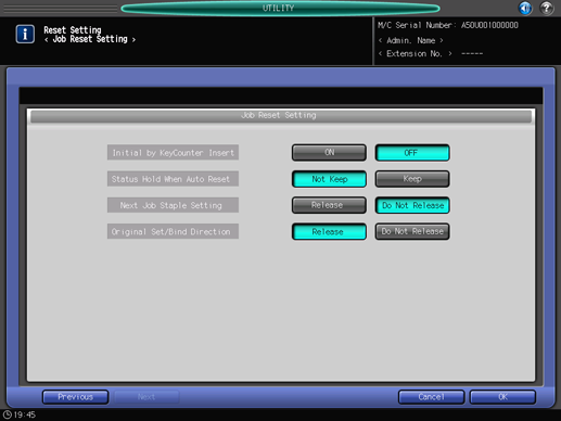 [Original Set/Bind Direction] | Specify whether or not to reset the Direction specified on the Original Setting screen and the Bind Direction specified on the Output Setting screen after completion of each job. | Release, Do Not Release |