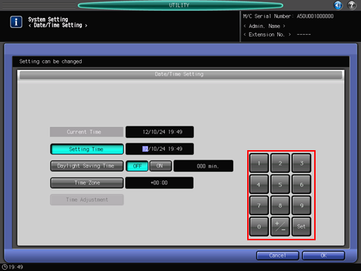 Press [Set] in the lower right corner of the touch panel keypad to fix the entry. The highlighted area shifts to the right. Repeat this procedure to set values for "Month", "Day", and "Time."