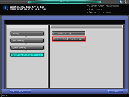 2. Press [System Setting] on the [User Setting Menu] screen, and then press [Operation/Info. Sound Setting] and [Info. Sound Item Setting] in sequence.
