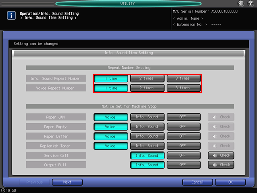 Specify the repeat count of Info. Sound or Voice that sounds when a job stops due to paper misfeed or paper out, and also specify whether or not to enable the sound individually for given items.