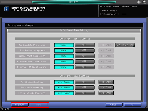 • The [Job Complete Pre-notice] provided under [Other Notification Setting] allows you to specify whether or not to use the expected job completion time for information sound. Press [Detail Setting], then select the desired time. Press [OK] to complete the setting and return to the previous screen.