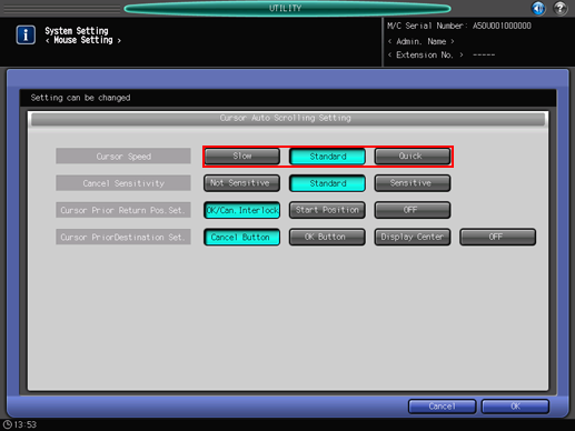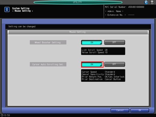 Cursor Auto Scrolling Setting: When selecting some items on [Job Ticket Edit] screen, another setting screen opens and the mouse cursor can be moved to the screen automatically. Specify the mouse behavior in detail.