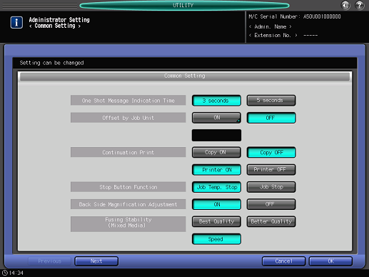 [One Shot Message Indication Time] | Select the time span to display a shot message, such as [Original size is A4], in the message area of the touch panel. | 3 seconds, 5 seconds |
