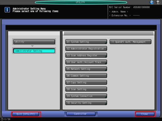 • To return through the hierarchy of the Utility menu, press [Close] until the desired screen appears.