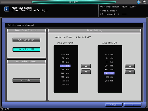 Select the power save mode to be activated when Power Save is pressed on the control panel. Select also the time to activate Auto Low Power/Auto Shut OFF. You can also select the condition of Auto Wake-up to activate the machine when a print job is received during Auto Shut OFF.