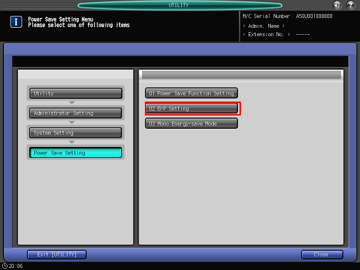 For subsequent operations, follow the same procedure as that in [User Setting] - [System Setting] - [Power Save Setting] - [ErP Setting]. For details, refer to Power Save Function Setting: Selecting the Power Save Mode.