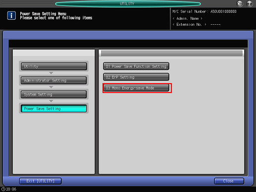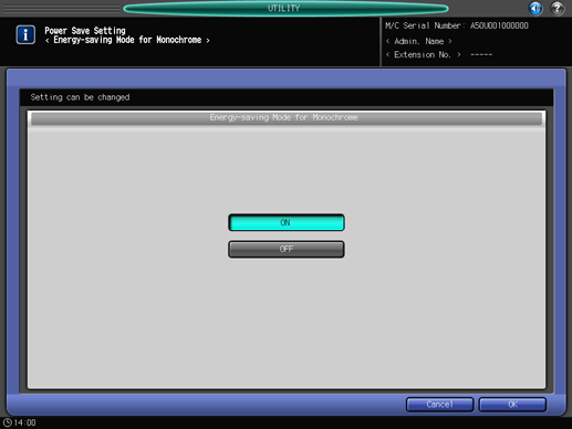 For subsequent operations, follow the same procedure as that in [User Setting] - [System Setting] - [Power Save Setting] - [Mono Energy-save Mode]. For details, refer to Mono Energy-save Mode: Using Energy-save Mode for Monochrome Printing.