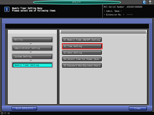 Press [System Setting] on the [Administrator Setting Menu] screen, and then press [Weekly Timer Setting] and [Time Setting] in sequence.