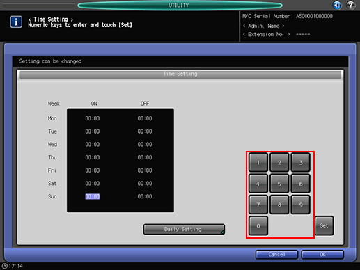 Use the touch panel keypad or the keypad on the control panel to enter the desired ON/OFF time. Press [Set] to shift the highlighted area.