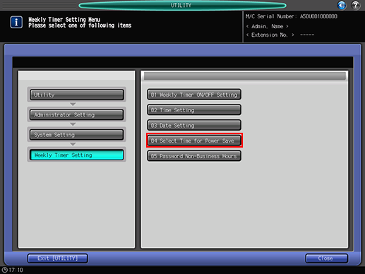 Press [System Setting] on the [Administrator Setting Menu] screen, and then press [Weekly Timer Setting] and [Select Time for Power Save] in sequence.