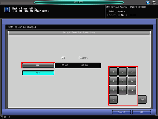 Use the touch panel keypad or the keypad on the control panel to enter the desired OFF time (in 24-hour expression). Press [Set], then similarly enter the Restart time.