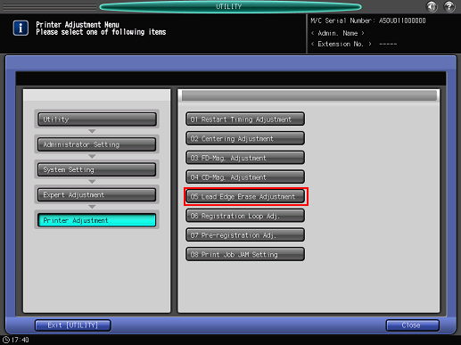 Press [System Setting] on the [Administrator Setting Menu] screen, and then press [Expert Adjustment], [Printer Adjustment], and [Lead Edge Erase Adjustment] in sequence.