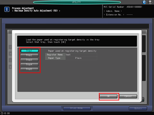 Note that the paper profile for the tray remains in the one used for registering a desired density.