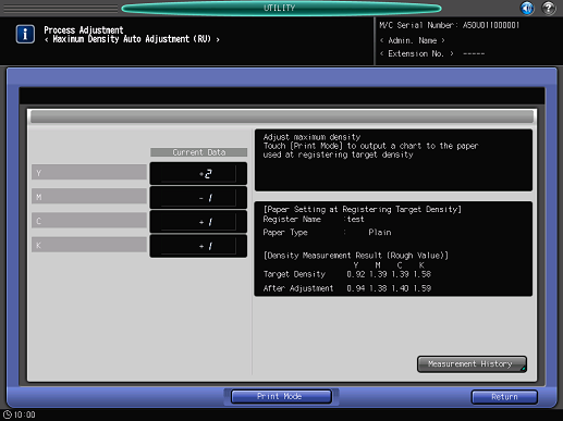 The result of automatic adjustment is displayed under [Current Data]. These values are reflected on Maximum Density Adjustment: Adjusting the Maximum Density for Y, M, C, and K.