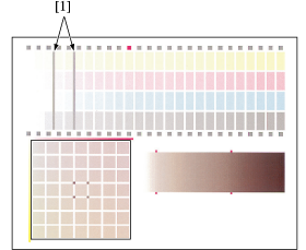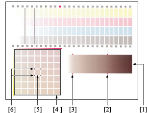 Next, focusing on the gray gradation pattern [1] created with C, M, and Y, check that the gray balance shows uniformity in the sections of square marks [2] and [3].
