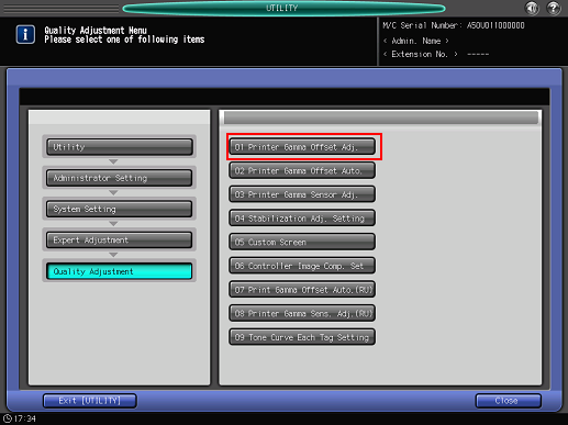 This adjustment is not needed if you operate [Administrator Setting] - [System Setting] - [Expert Adjustment] - [Quality Adjustment] - [Print Gamma Offset Auto. (RU)] on the [Utility Menu screen]. For details about [Print Gamma Offset Auto. (RU)], refer to Printer Gamma Offset Auto. (RU): Automatically Adjusting the Printer Gamma Offset Using the Color Density Sensor.