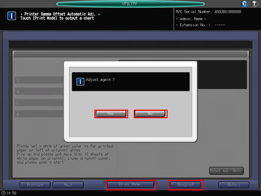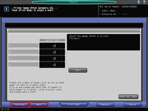 Press [Start] on the screen, or Start on the control panel. The current data of YMCK will be updated.