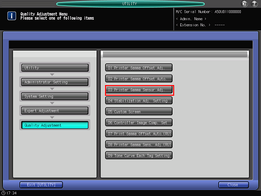 Press [System Setting] on the [Administrator Setting Menu] screen, and then press [Expert Adjustment], [Quality Adjustment], and [Printer Gamma Sensor Adj.] in sequence.