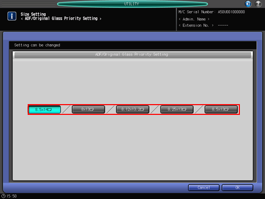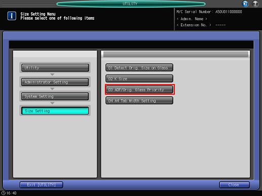 Press [System Setting] on the [Administrator Setting Menu] screen, and then press [Size Setting] and [ADF/Orig. Glass Priority] in sequence.