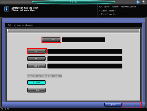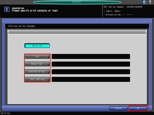 Select [No Print], if you do not want Item 1 to be printed. The setting is deleted when [No Print] is pressed after setting the [Text], [Date/Time], or [Annotation No.].