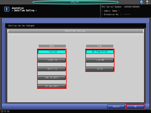 Press [Date/Time] to display the [Date/Time Setting] screen. Select one of the [Date] options and one of the [Time] options, then press [OK].