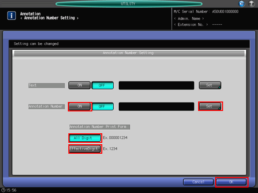 Press [All Digit] to print all nine digits of the entered annotation number or [Effective Digit] to print only the effective digits under [Annotation Number Print Form.]