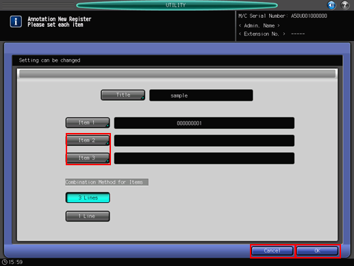 [Item 1] [Item 2] [Item 3] | Overview | For each of [Item 1], [Item 2], and [Item 3], select one annotation type from [Text], [Date/Time], or [Annotation Number], and set contents to be printed. You can only have one set of annotation for each item. Press [No Print] if you do not want the annotation to be printed. Press [Text Setting] to specify the size and font of the text printed. |