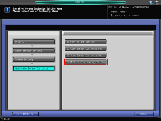 Press [System Setting] on the [Administrator Setting Menu] screen, and then press [Operation Screen Customize] and [Machine Function Key Setting] in sequence.