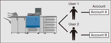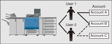 This system configuration is suitable for tracking individual users managed by each department when the machine is shared with multiple departments. With this setup made, the machine allows you to maintain the statistics both on each employee (each user) and on each department (each account).