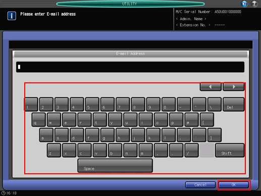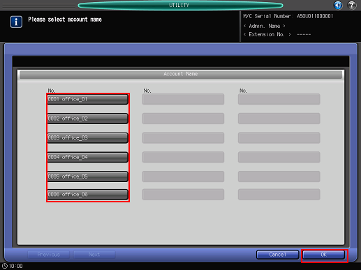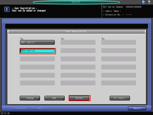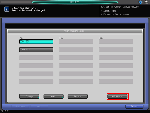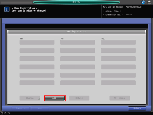 Use the touch panel keypad to enter the desired user number. A User No. can be set, using numeric characters, in the range of 1 to the upper limit, which is the value entered for User Distribute Number.