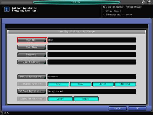 Use this function to assign a number to each user, and set User Name, Password, E-mail Address, Account Name, Max. Allowance Set, Usable Function, IC Card Registration, and [Color]/[Black] Output Permission for each user number.