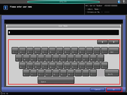 Press [User Name] to display the [User Name Setting] screen. Enter the desired user name. You can enter up to 64 one-byte characters (32 two-byte characters) for the user name. For more information about how to enter characters, refer to Inputting Characters.