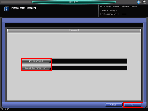 Press [Password] to display the [Password Setting] screen. Press [New Password] to display the [New Password Entry] screen. Enter a password, and press [OK]. Press [Input Confirmation] to display the [Input Confirmation] screen. Enter the same password, and press [OK]. You can enter up to 64 one-byte characters for the user password. For more information about how to enter characters, refer to Inputting Characters.