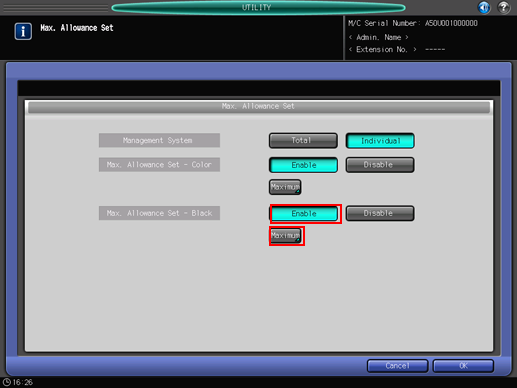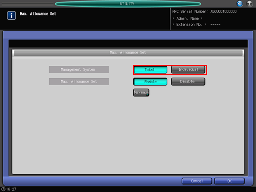 Press [Max. Allowance Set] to display the [Max. Allowance Set] screen. Specify the functions to be available to the authenticated user. Selecting [Individual] for [Management System] enables the limit count to be specified separately for Color and Black. Select [Enable], and then press [Maximum] to enter the desired limit count.
