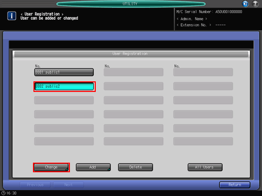 Select the user name of the data to be changed, then press [Change] to display the [User Register Add/Change] screen.