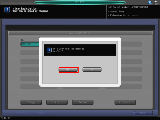 Press [Yes] to confirm the change and return to the [User Registration] screen. Pressing [No] takes you back to the [Change All Users] screen. To return to the [User Registration] screen, press [Cancel].