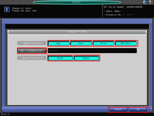 Change the Usable Function, Max. Allowance Set, and Output Permission for all users collectively.