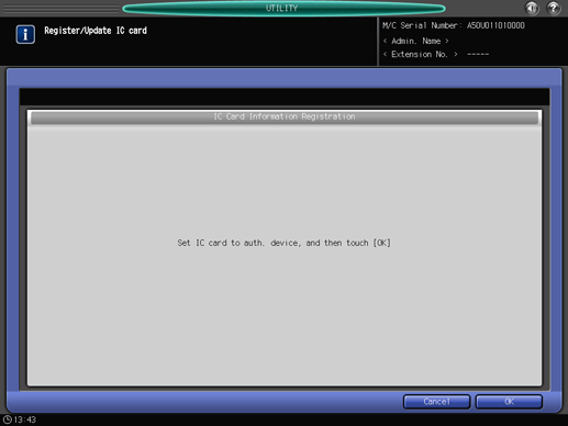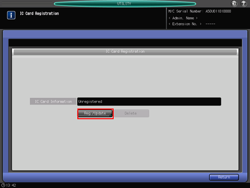 Press [IC Card Registration] to display the [IC Registration] screen. Press [Reg./Update] to display the [IC Card Information Registration] screen. Hold the IC card over Authentication Unit AU-201/Authentication Unit AU-201S, connected to the main body. The screen returns to the [User Registration] screen, and the display to the right of [IC Card Information] changes from [Unregistered] to [Registered].