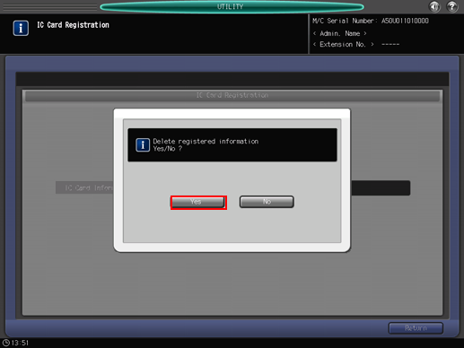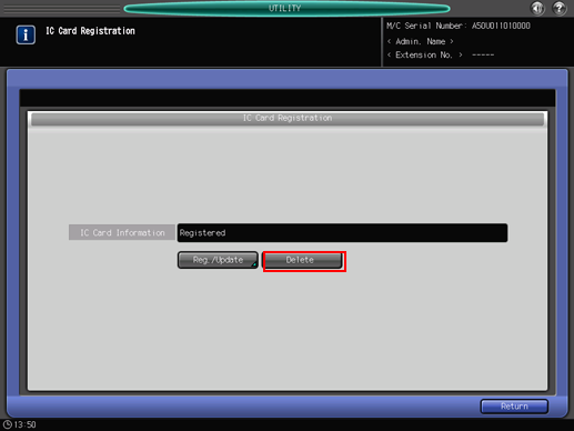 To delete the registered information of the IC card, press [Delete]. A confirmation dialog is displayed. Press [OK] to delete the former information and restore the display [Unregistered] on the right side of [IC Card Information].
