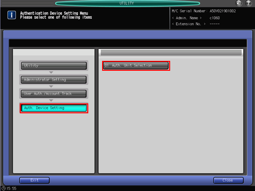 Press [User Auth./Account Track] on the [Administrator Setting Menu] screen, and then press [Auth. Device Setting] and [Auth. Unit Selection] in sequence.