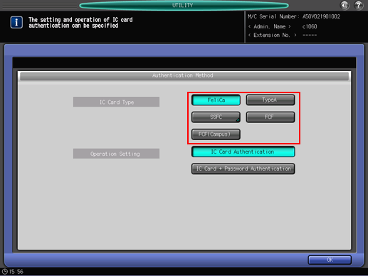 Select [IC Card Authentication] if you want to use only the IC card for authentication. To use both IC card and password for authentication, select [IC Card + Password Authentication].