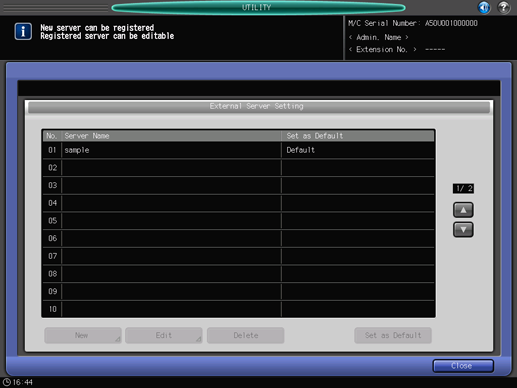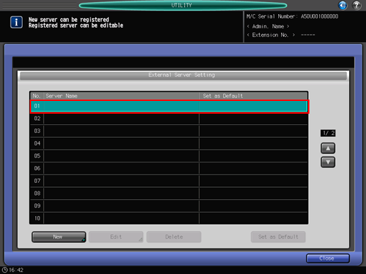 Select a blank line on the [External Server Setting] screen and press [New Registration] to register a new external server.