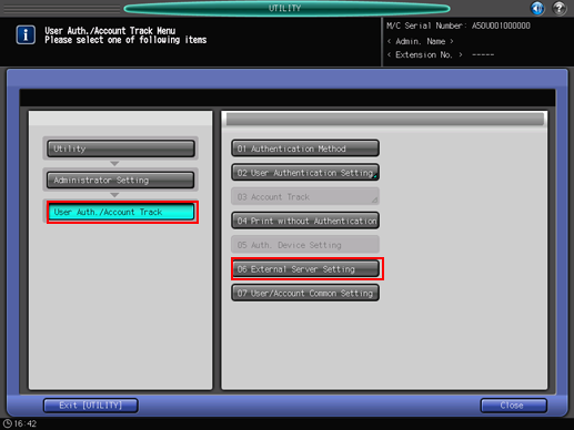 Press [User Auth./Account Track] on the [Administrator Setting Menu] screen, and then press [External Server Setting].