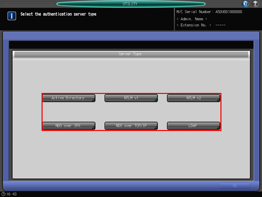 Press one of the following options to configure the details: [Active Directory], [NTLMv1], [NTLMv2], [NDS over IPX], [NDS over TCP/IP], and [LDAP].